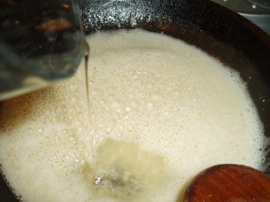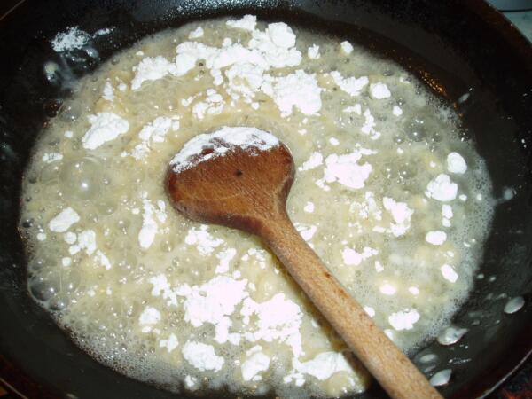 Разогрели свиной жир, кладем в него пару столовых ложек муки без верха и прожариваем её до золотистого цвета. После чего отключаем под сковородкой огонь и вливаем в неё холодную воду, помешивая муку (дабы комки не образовывались!) и разводя её до консистенции густой сметаны. Всё, ранташ — обжаренная на жире и разведенная холодной водой или молоком мука — готов.