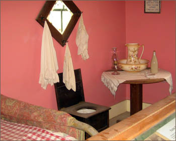 Оно представляет собой небольшой домик с двумя дверями на его противоположных концах (что-то вроде контейнера для габаритных грузов, только с окошком). Посредине находится железная полуторная кровать «с шарами», сундук для одежды, на стенке — зеркало, в углу — «ночная ваза», кувшин с водой, бутылочка с дезинфекцией (уксус)!