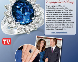только сейчас открыла свой почтовый ящик и получила нечто интересное: обротистые американцы предлагают всем желающим копию кольца, которое было подарено Кейт принцем Уильямом. Всего за 20 баксов любой может приобщится к грядущему событию. Имеются все размеры!