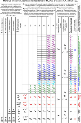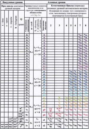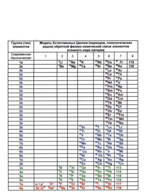 Ниже привожу Естественную систему элементов материи (Периодическую таблицу элементов, где все Естественные Циклы -периоды атомного уровня материи в правильных границах оканчиваются на элемент группы щёлочноземельного металла) под авторством Ю. Л. Мейер (1864) - (Д. И. Менделеев (1869-1871-1906)) - К. Е. Цименс (1948) - В. М. Клечковский (1950) - А. К. Макеев (1999-2010).