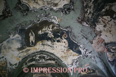 Храм очень интересен своими росписями. Забыл, как называется эта методика, но очень редко встречающаяся, когда на предварительно нанесенный слой белой штукатурки наносится следующий слой темной краски, а как она подсохнет, то по ней специальным инструментом до штукатурки процарапывается рисунок. Он получается как бы монохромным - белое на черном. Очень редко встречающийся способ храмовой росписи. И вот он тоже гибнет...