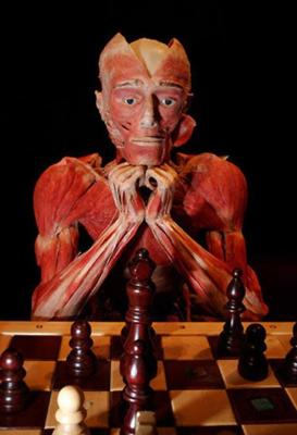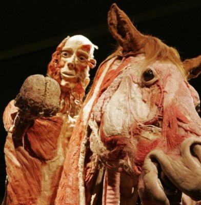 Что может увидеть посетитель на такой выставке? Очень необычные экспонаты. Скажем, что это зрелище не для слабонервных. Например, «скульптура наездника» представляет собой человека без кожи верхом на лошади без шкуры. Взору открывается все внутренние органы и сухожилия кадавра, а в руках он держит собственный мозг! Еще один из «экспонатов» восседает за шахматной доской. Место напротив свободно. Он как бы приглашает сыграть партию в шахматы.