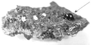 Получите мой фульгурит по базальту. Диаметр капли - 6 мм. Массивный кусок породы - базальт, из которого и был выплавлен фульгурит.