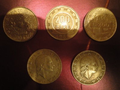 Одна монета (белая) 50 лир, три монеты (тоже белые) по 100 лир (лицевая и оборотные стороны) и пять монет (желтые) по 200 лир. Монеты по 200 лир интересны тем, что отчеканены они в разные годы. Поэтому одна из сторон монеты почти у всех них одинаковая. А вот вторая сторона отличается (второй ряд справа, три монеты) в зависимости от года чеканки.