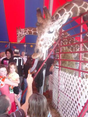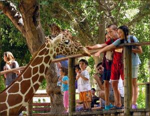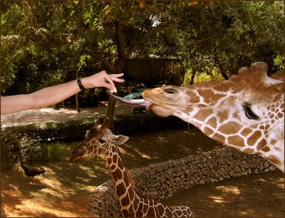 Тренированный по 20 часов в день притягивать ко рту ветки акации, требовательный жирафий язык ловко собирает кусочки корма с человеческих ладоней. Не каждый посетитель решается попробовать покормить, не каждый хочет повторить, уж очень скользкий у жирафа язык — густая слюна является природной защитой от колючек акации. Но и не у каждого посетителя дикий жираф принимает еду. Некоторые так и остаются стоять с протянутой ладошкой, не удостоенные вниманием.