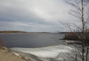 Река Сегежа. Если присмотреться, за дальним лесом, там где разрыв в его стене между левой и правой частями, можно увидеть белый дым из труб работающего комбината.