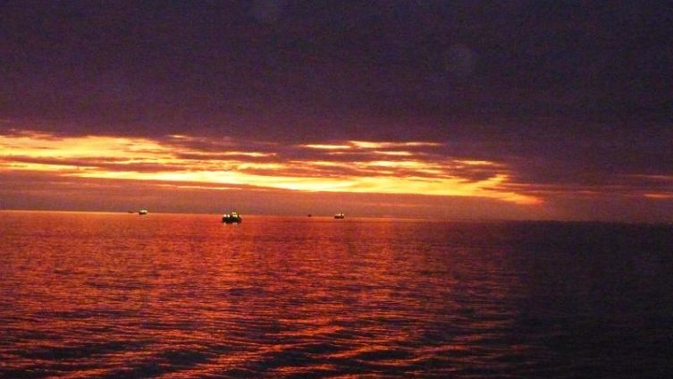 Морское путешествие хорошо тем, что можно встречать рассветы и любоваться заходом солнца, если, конечно, погода позволяет. Мы шли на юг, в тропический пояс, и рассчитывали на солнечную погоду! В Галвестоне 29 декабря было относительно тепло, солнечно, +17 С, хотя к вечеру появились слоистые облака — предвестники дождя. Ранним утром 30 декабря многие пассажиры, и я в том числе, устремились на верхние палубы встречать рассвет и солнце. Но дул свежий ветер, небо было затянуто тучами, лишь на несколько минут в дымке показалось солнце — фотоаппарат зафиксировал время выхода солнечного диска — 8 часов 12 минут. А потом солнце спряталось и начался дождь. Ну, вот и «позагорали»…