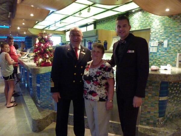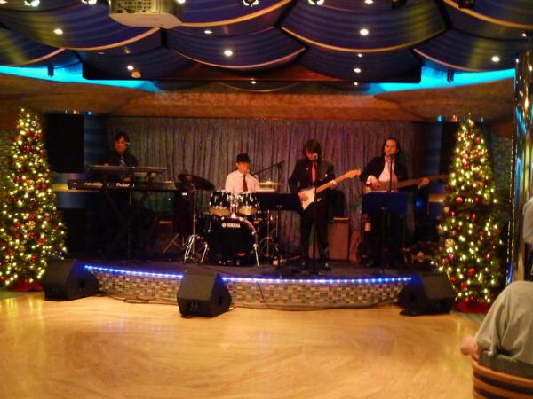 Во время ужина в ресторане представили небольшой концерт наши официанты, большинство из которых были латиноамериканцы, они замечательно спели несколько песен на испанском языке. После ужина нарядно одетая публика — взрослые и дети, стала собираться в большом, самом ярком и нарядном лобби третьей палубы, где все время играли музыканты на эстрадной площадке. В 23 часа там появились капитан судна и директор круиза. Самым для нас удивительным было, что капитан очень хорошо пел на итальянском и английском языках в сопровождении музыкантов, и при этом все время пританцовывал под музыку — такой веселый человек! И пассажиры многие подпевали и танцевали.