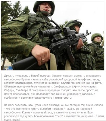 По Крыму идут колонны военных Уралов с российскими номерами (или это такой коллаж укрТВ, с подменой номеров?), люди в камуфляже открыто говорят "Мы из России", а истории о том, что, как заявил Путин "такое обмундирование можно купить в любом военизированном крымском магазине) - смеяться или плакать?