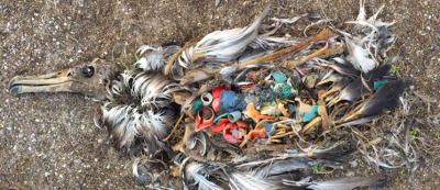Фото: останки птицы на берегу, можно видеть содержимое ее желудка (источник: ecowatch.com)