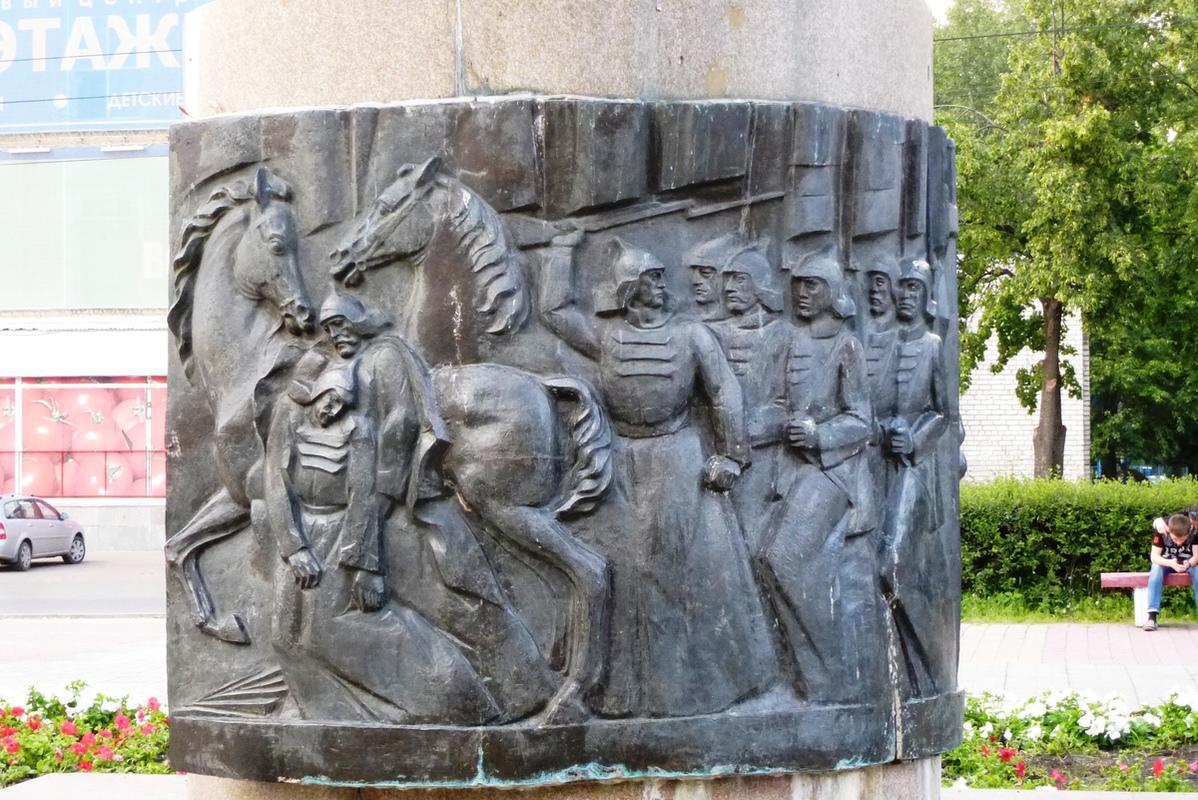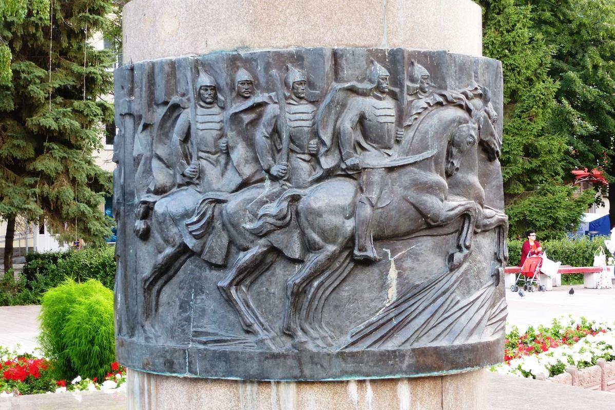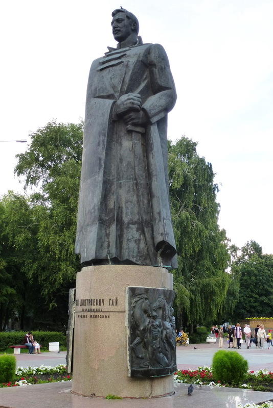 Уже покидая город, мы увидели впечатляющий памятник, который заставил нас остановиться и подойти к нему. Это оказался памятник Гаю Дмитриевичу Гаю (Бжишкяну), комдиву Железной. На небольшом круглом постаменте стоит в полный рост человек в шинели с непокрытой головой, а по постаменту скачут с шашками наголо и идут в штыковую атаку бойцы легендарной Железной дивизии.