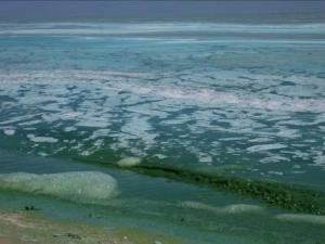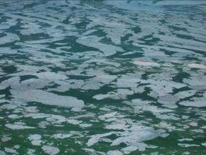 р.Волга. Это не лед - это плесень и сине-зеленые водоросли на поверхности реки! Середина августа 2005 года.