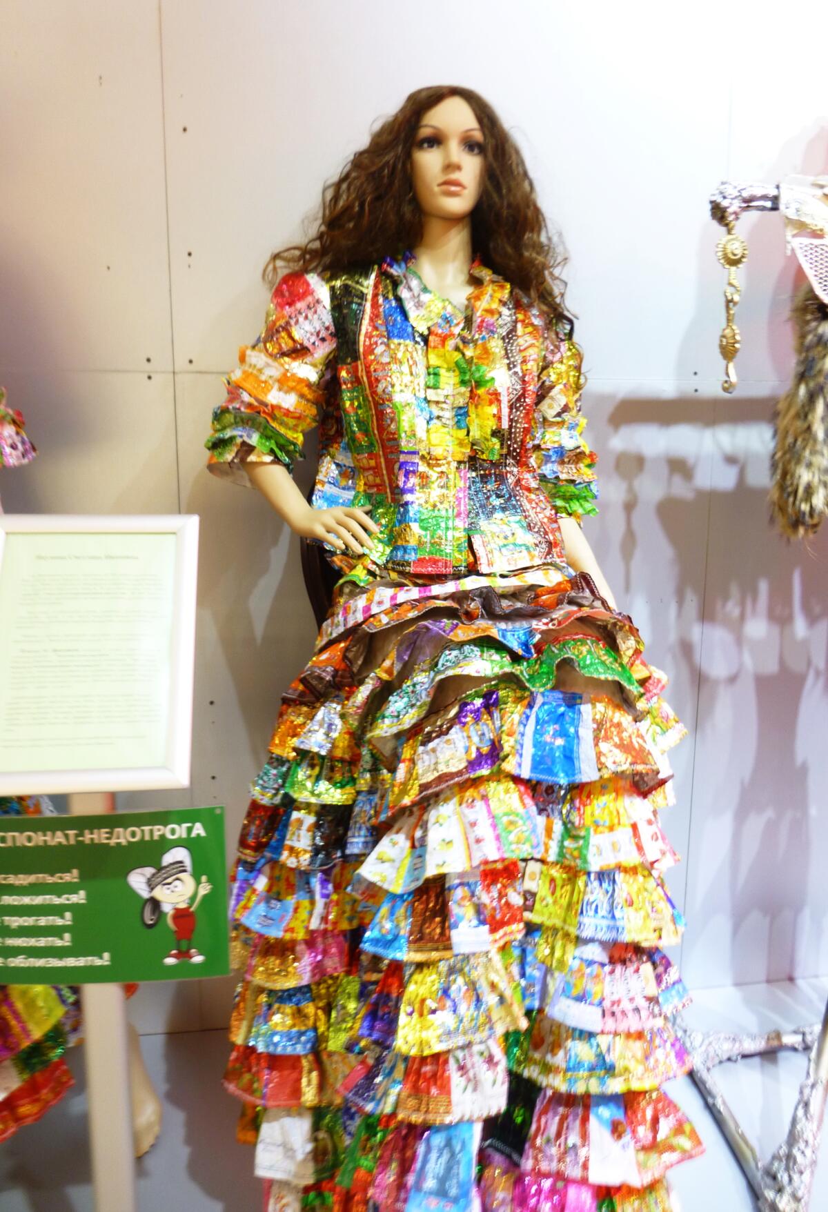 Удивительное по красоте платье из конфетных фантиков и обёрток от сладостей завоевало первое место на детском конкурсе «Золотые руки мастеров» в номинации «Арт-мода, модели из нетрадиционных материалов». Материал собирали всем коллективом около года, дети сами подбирали фантики по фактуре и размерам, некоторые научились сшивать бумажные лоскутки в полосы, ставшие впоследствии элементами выкройки.