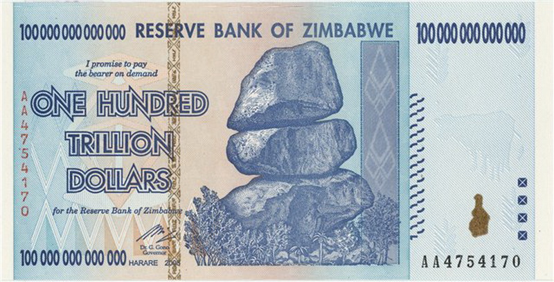 В Германии в 1924 тоже была купюра в 100 трлн.марок, хотя там инфляция была в 50 раз меньше, чем в Зимбабе.