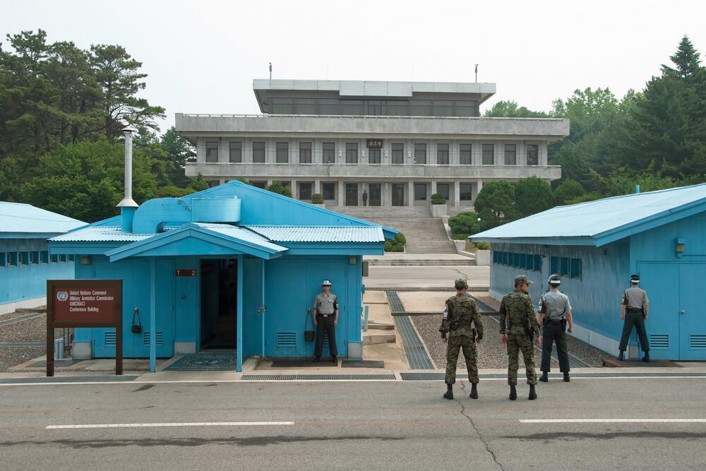 Непосредственно сама граница представляет собой несколько бараков, в которые можно войти как с южнокорейской, так и с северокорейской стороны. Посередине бараков проходит линия, которая и разделяет две Кореи. Также внутри барака стоит стол переговоров, который наполовину стоит в одном государстве, а второй половиной — в другом. Туристов в эту зону привозят обе стороны, однако одновременное нахождение туристов с обоих сторон в бараке невозможно.