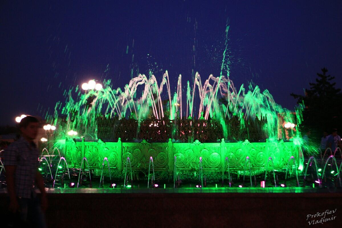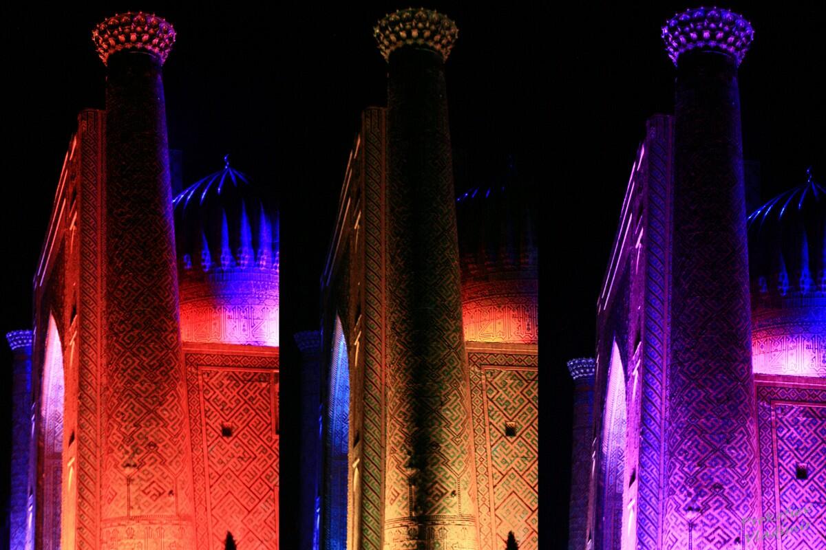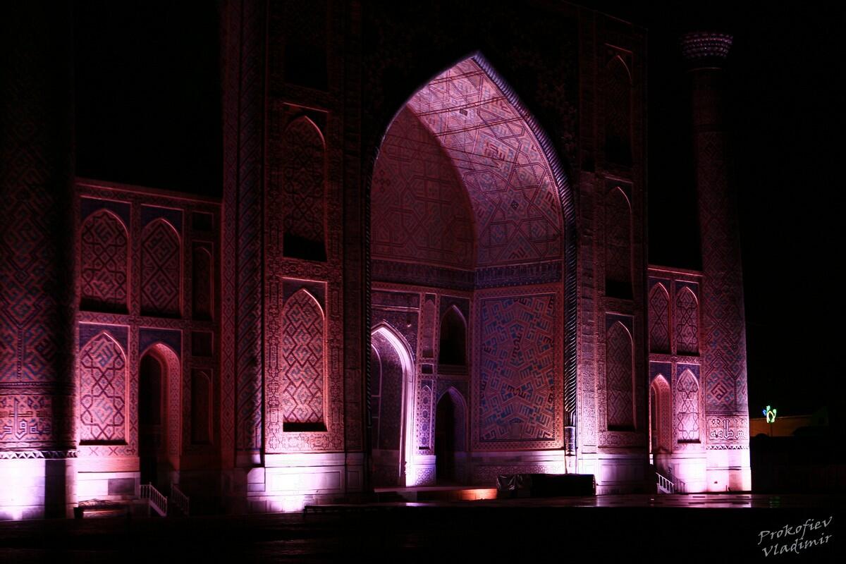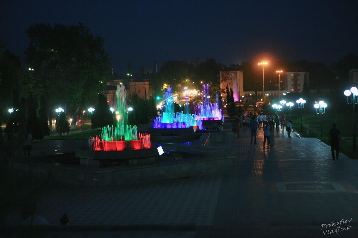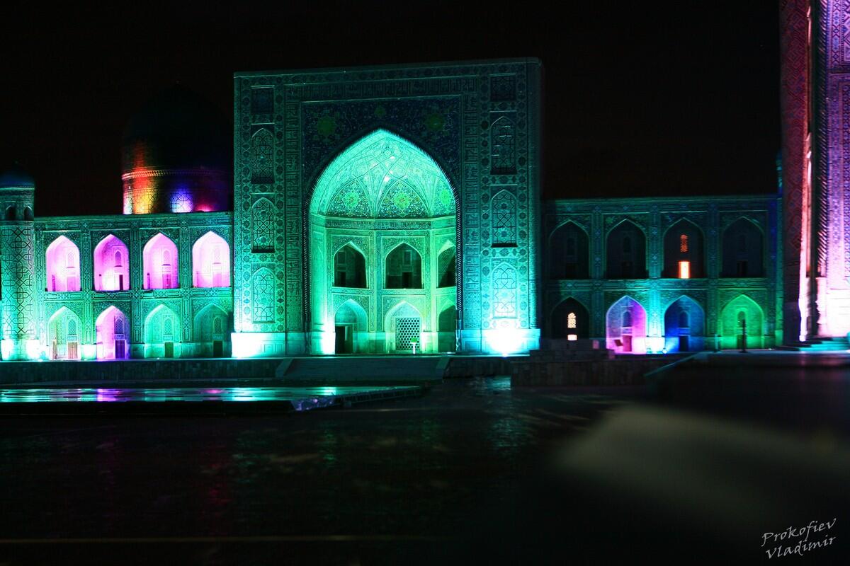 Вечерами в историческом центре Самарканда совсем не скучно. Масса гуляющей публики, каждый готов пообщаться, атмосфера очень дружелюбная. Но желательно знать английский. Помимо светового шоу на Регистане, здесь можно увидеть цветомузыкальные фонтаны — впечатляющее зрелище.