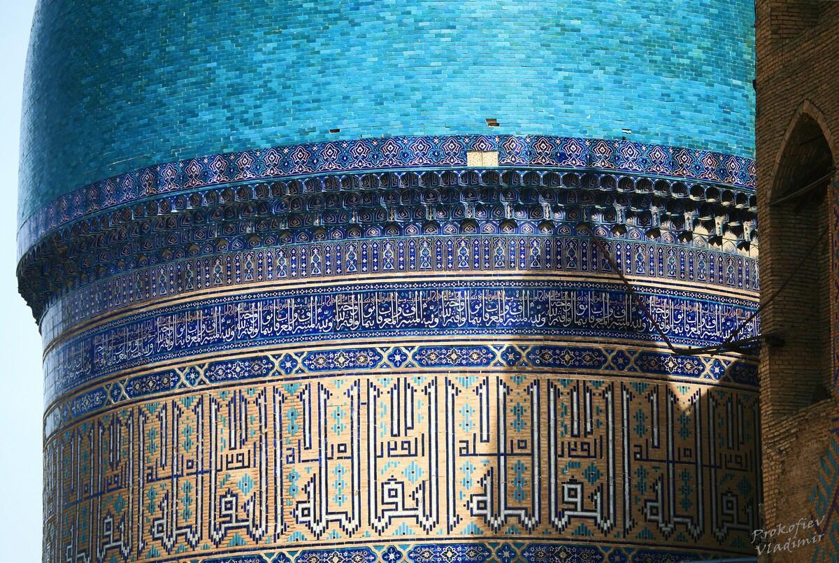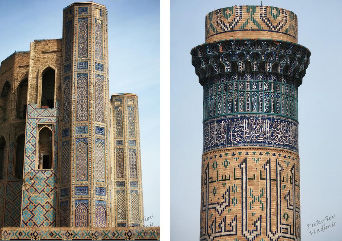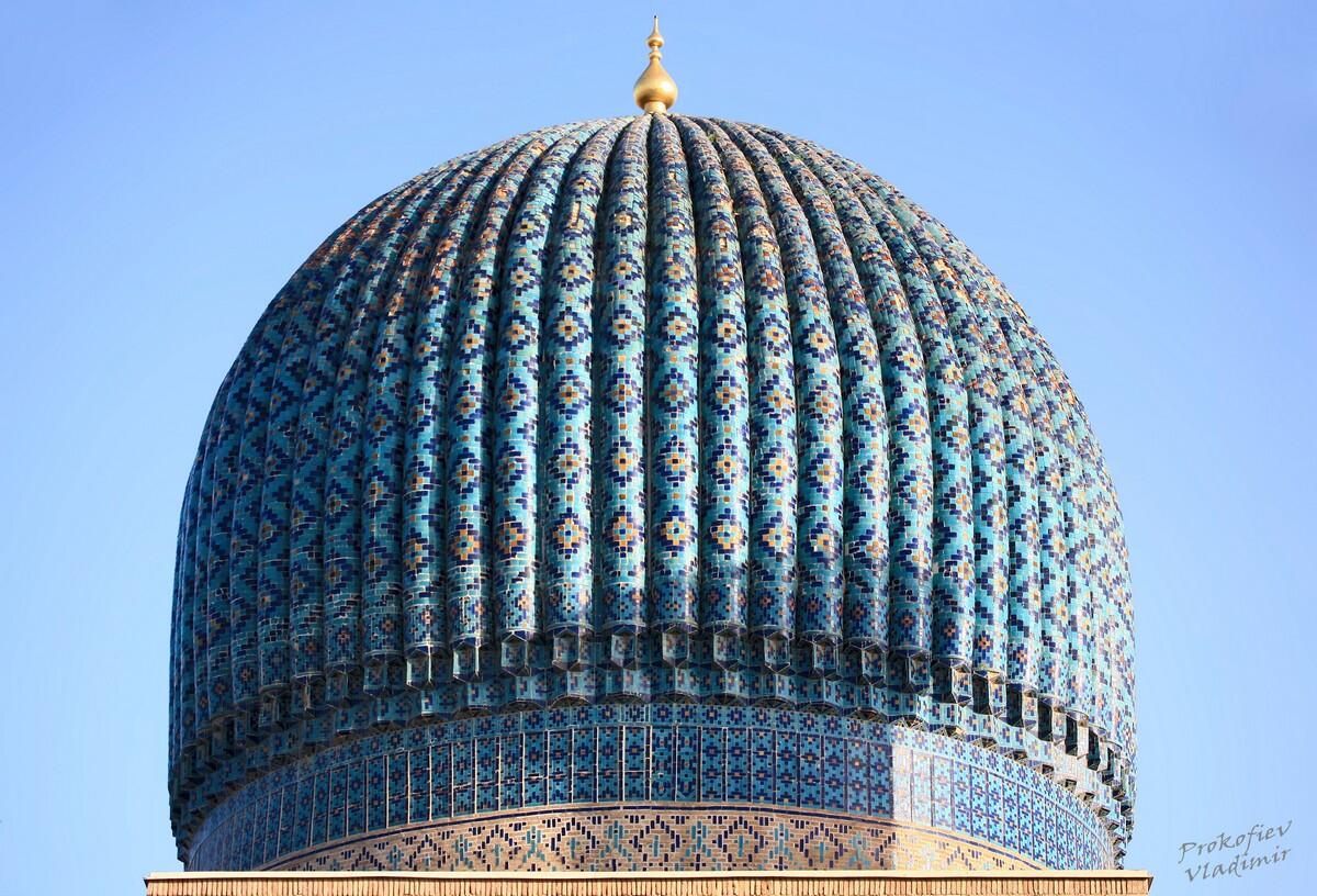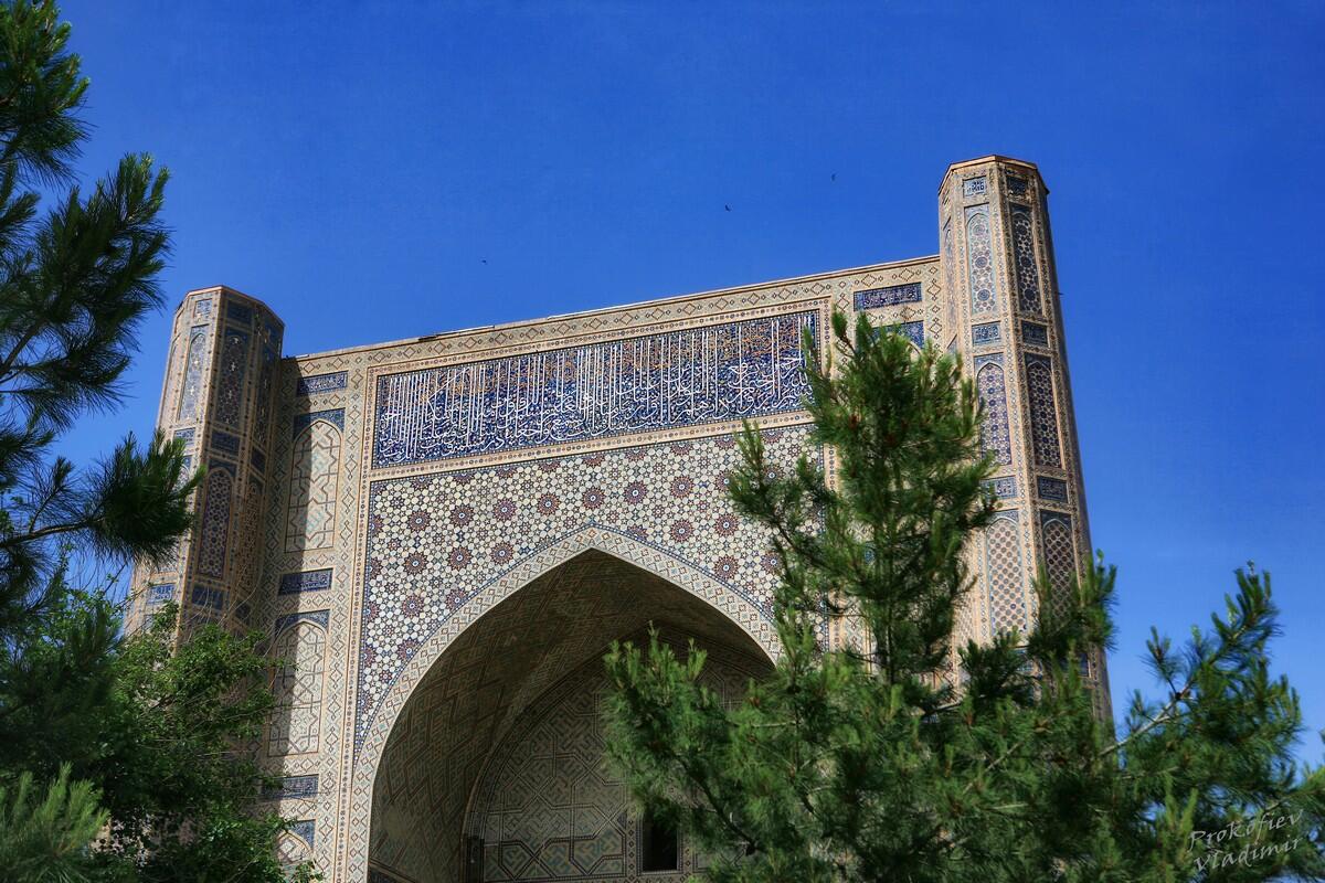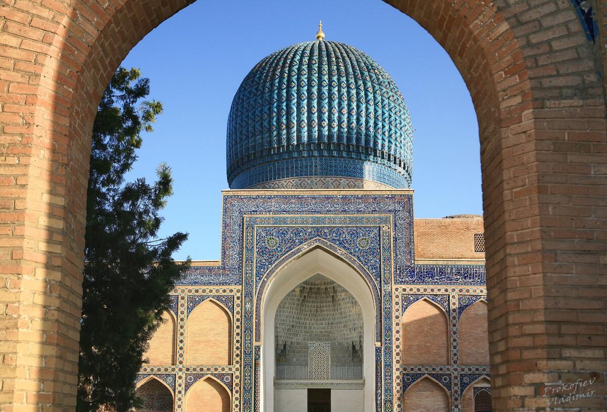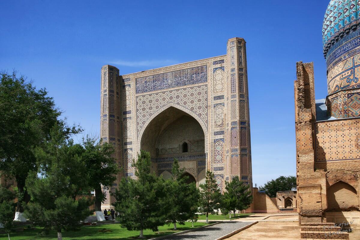 Это большая соборная мечеть Тамерлана (1399—1404 гг.), украшенная изразцами, резным мрамором и росписями.