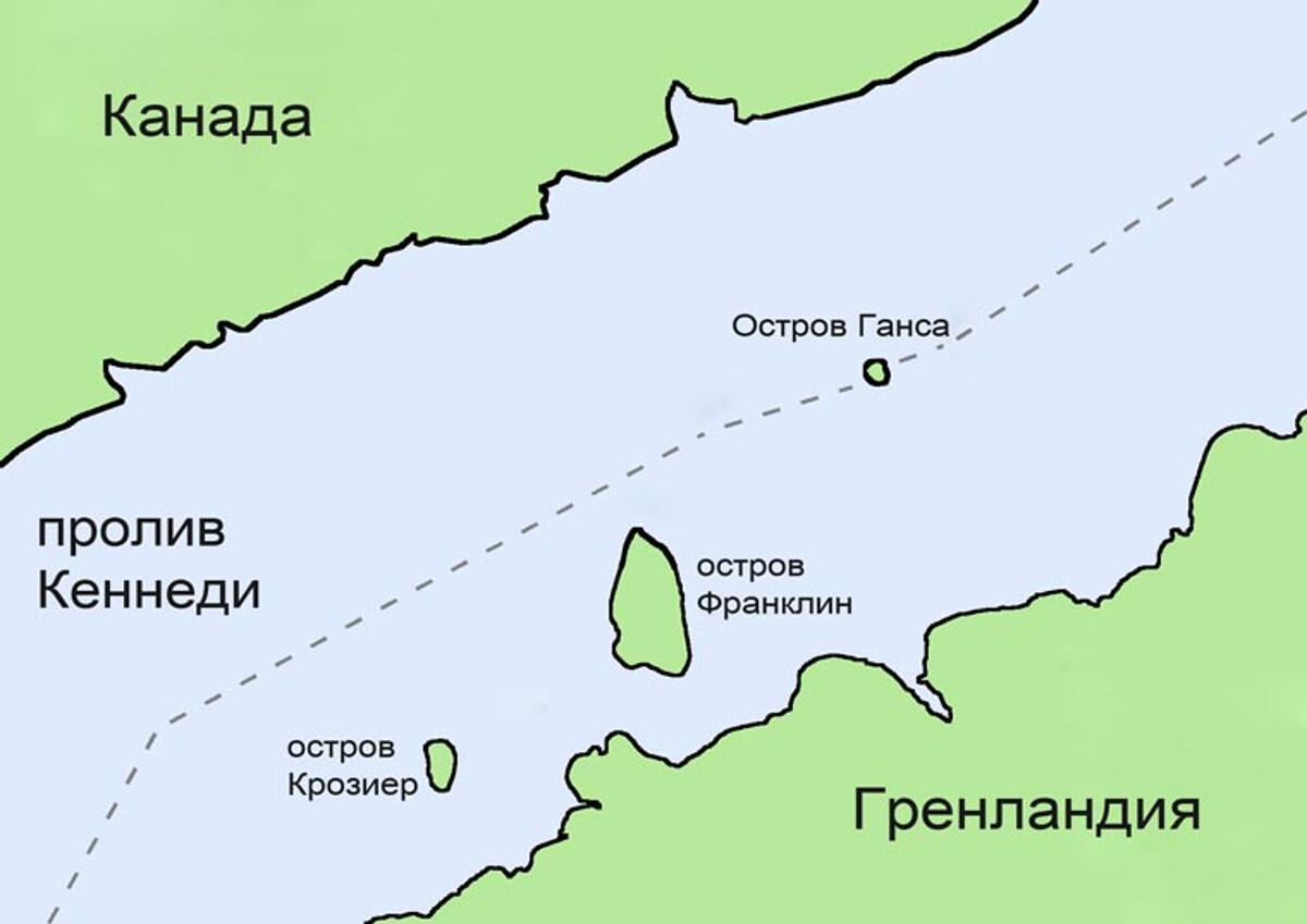 Стратегическое положение? Не смешите! Островок находится в узком проливе Кеннеди, разделяющем побережья Канады и Гренландии, как раз посередине. Ширина пролива 35 км. Граница территориальных вод по международным правилам заканчивается в 12 милях (22,2 км) от берега. Вот и получается, что претендовать на него могут обе страны. А поскольку Гренландия принадлежит Дании, то за остров Ганса «бодаются» Канада и Дания. Давно уже «бодаются».