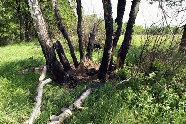 Сейчас в урочище насчитывается около 400 полностью выгоревших больших деревьев. В некоторые из них шаровые молнии попадали по два-три раза, что видно по характеру повреждений! Если деревья растут тесно друг к другу, то шаровая молния бьет точно между ними, образуя довольно глубокую яму между стволами в момент своего взрыва. Вспышка настолько сильная, что мгновенно выжигает в стволах вертикальные каналы, которые могут затем дымиться несколько часов.
