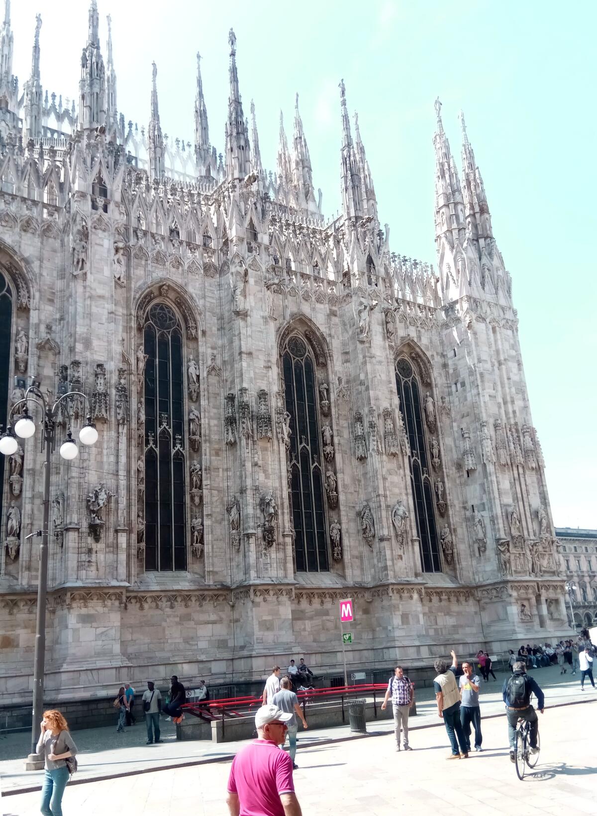 Во-первых, Дуомо, миланский собор. Это — главная достопримечательность города. Дуомо — второй по величине в Европе готический собор. Он посвящен рождеству Богородицы. Он непрерывно строился в течение семи веков.