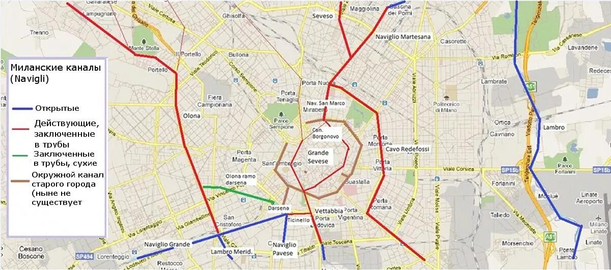 Во время строительства знаменитого собора сюда проложили несколько каналов, по которым доставляли глыбы мрамора из далёких каменоломен. Каналы выполняли ещё одну важную роль: поили город водой из альпийского озера Комо.