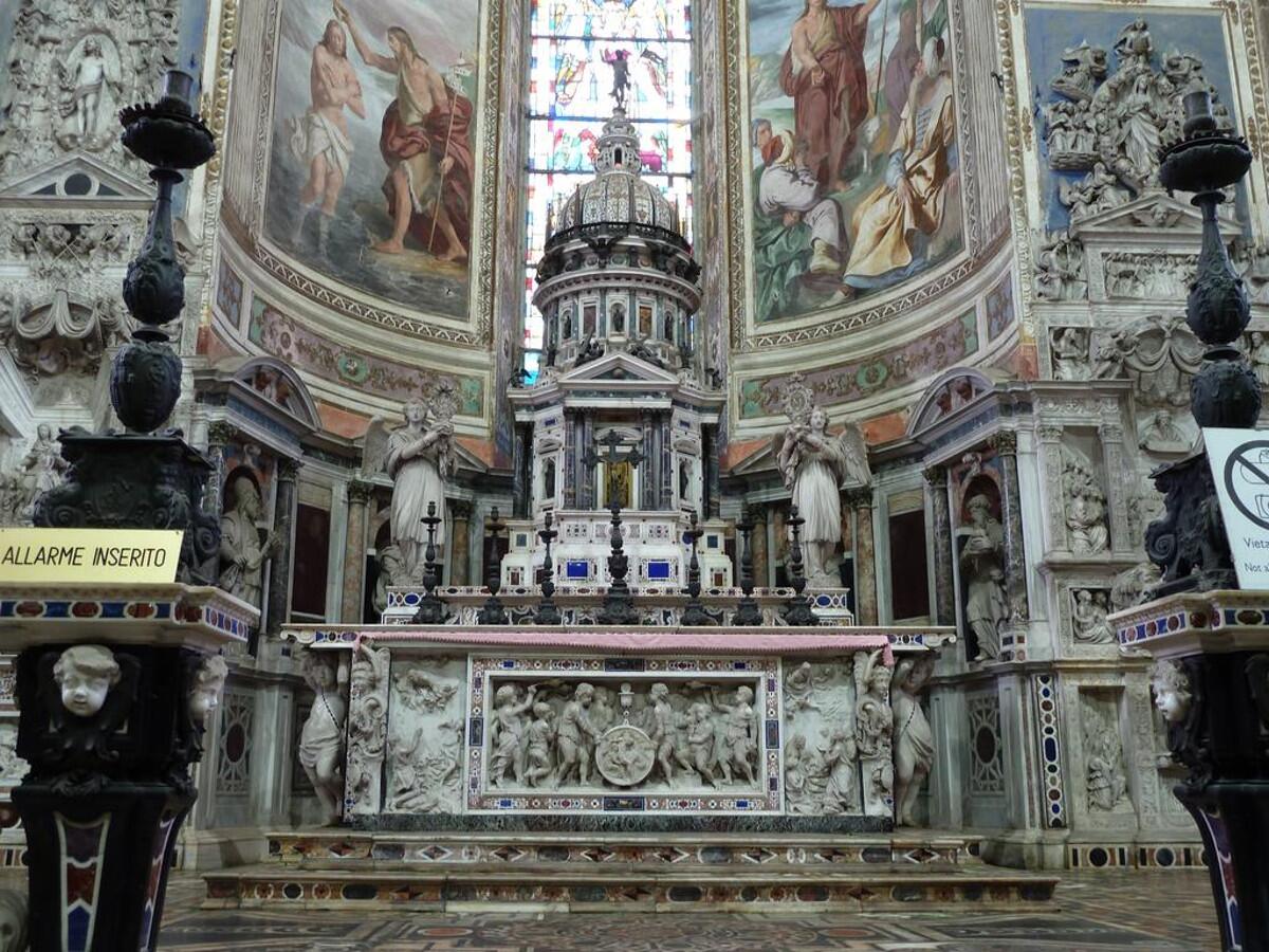Внутри такое же разностилье, но не раздражающее, а радующее глаз. Крестообразный готический свод, расписанный под звездное небо, и высокий центральный купол расписанный фигурами святых в стиле Возрождения, дополняют друг друга и тянут взгляд вверх. Церковь с роскошным мраморным алтарем, с расписными стенами и резьбой по дереву на скамьях молящихся. Мраморные же надгробные памятники донаторов строительства, членов семей Висконти и Сфорца.