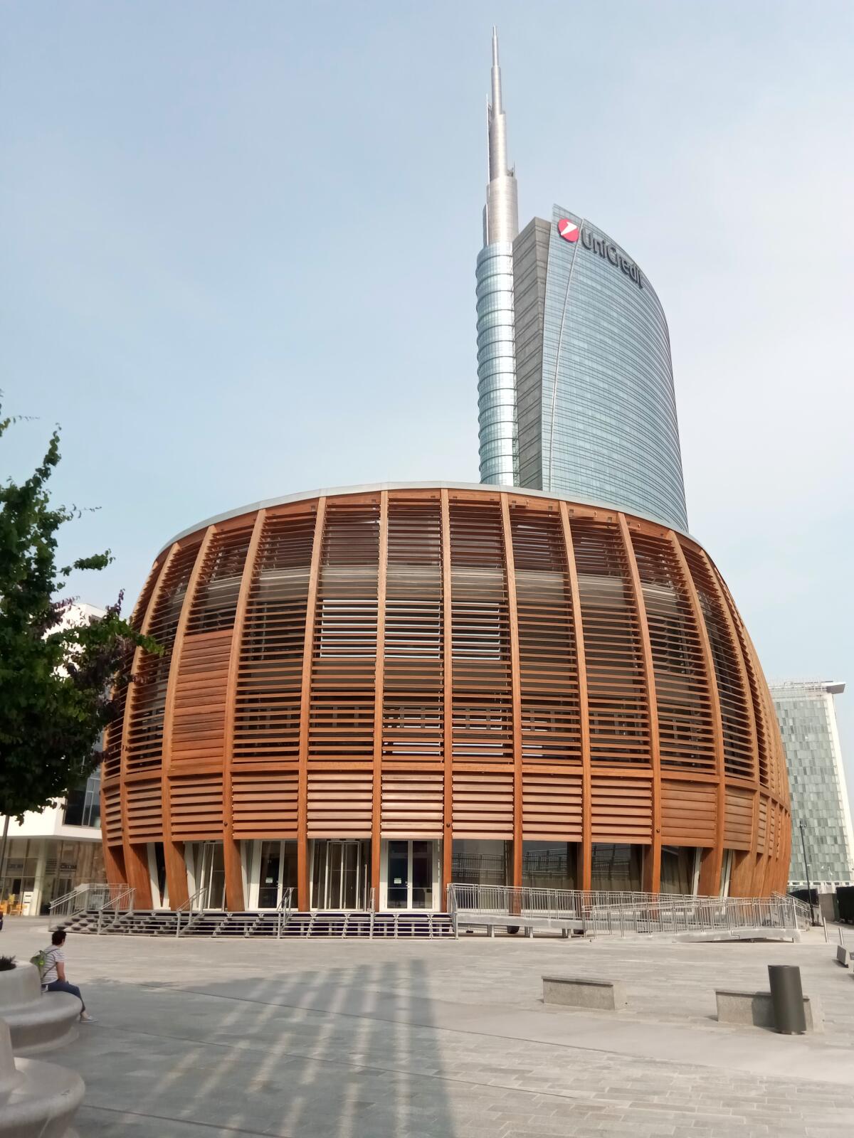 Рядом два уникальных высотных жилых здания, одно высотой 119 метров, а второе — 87 метров. Название этого комплекса «Bosco Verticale», что переводится на русский язык как «Вертикальный лес». Балконы здесь украшены разнообразными растениями, среди которых 800 полноценных деревьев. Подобного соединения жилых зданий и природы нет более нигде в мире. Озеленение небоскребов — чисто миланская фишка.