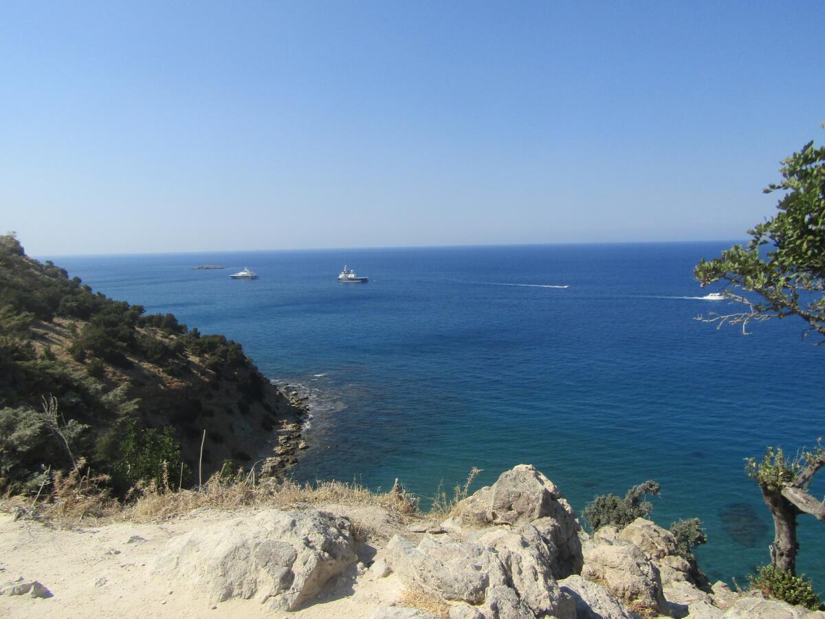 В купальне Афродиты — удивительная лагуна. Сверху смотришь, и дух захватывает, купаться в лагуне — огромное удовольствие. Вход пологий, вода чистейшая, в маске и с трубкой плавать замечательно. Сама купальня не производит мощного впечатления, но вот виды… Да, Афродита умела выбирать места для гигиенических и любовных процедур!