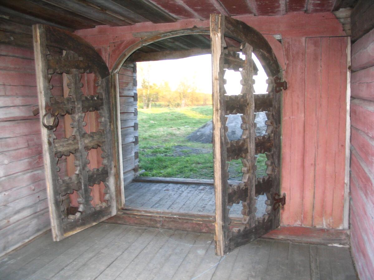 На снимке достаточно хорошо просматриваются как резные деревянные элементы, которыми церковь богато украшена, так и оба резных фронтона. Первый — посредине восьмерика, второй — в месте, где четверик переходит в восьмерик.