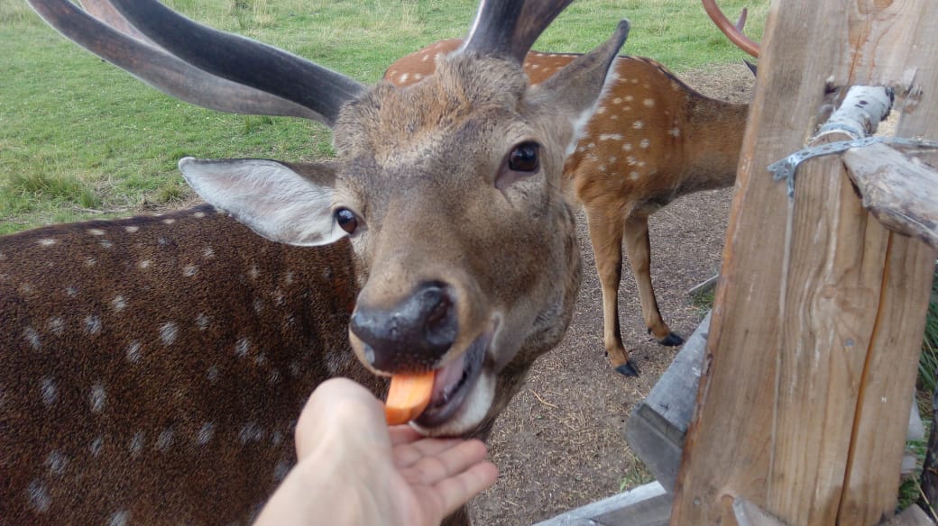 Олени замечательные! Кормить их с руки — одно удовольствие. Тем более что это абсолютно безопасно, стоит только протянуть что-нибудь съестное (морковь, кукурузу, яблоко, ананас). В это время года рога у них ещё покрыты вельветом, и оттого они тёплые и приятные на ощупь. Только трогать их надо осторожно: оленям это нравится настолько же, насколько людям нравится, когда их трогают за уши. Тем не менее животные вовсе не агрессивны, при желании можно выйти из вольера и погладить их по спинке.