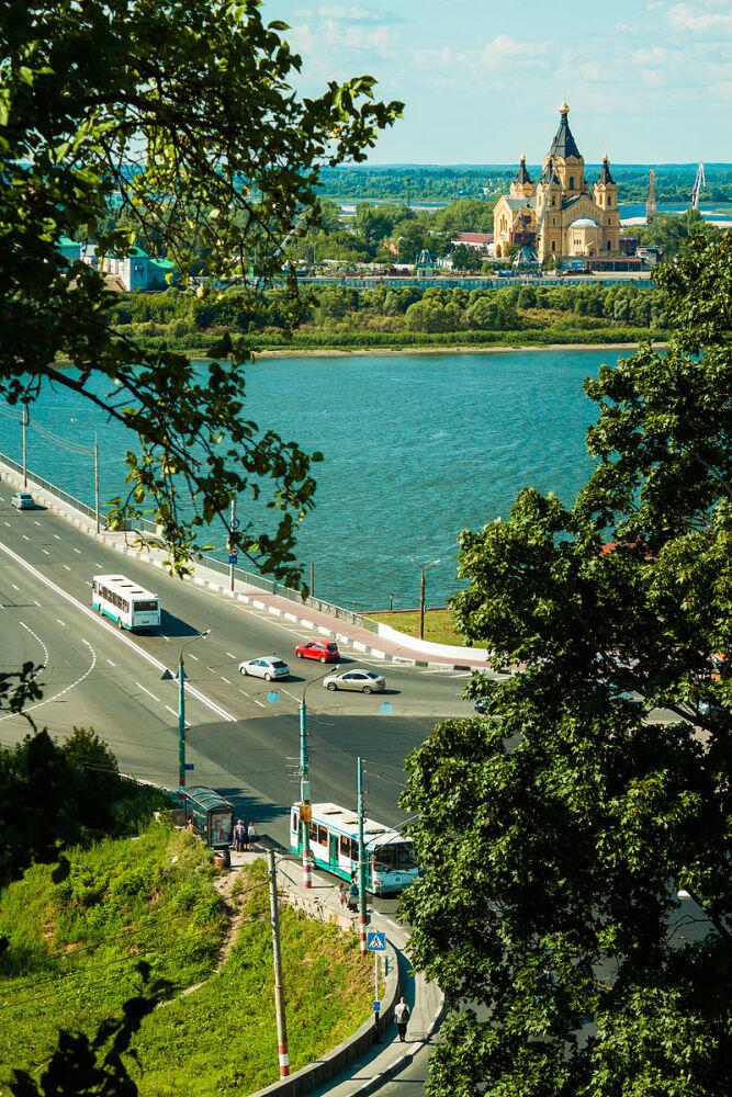 Именно на этой улочке возвышается удивительный собор Александра Невского. С моста он производит потрясающее впечатление, особенно, когда видишь его впервые. Такое укромное место, наверное, настраивает прихожан на таинство общения с Богом. Крест на куполах храма сияет, будто путеводная звезда, указывая дорогу. А своим расположением у слияния рек храм будто благословляет, напутствует двух путешественниц — Оку и Волгу, перед дальней дорогой к Каспийскому морю.