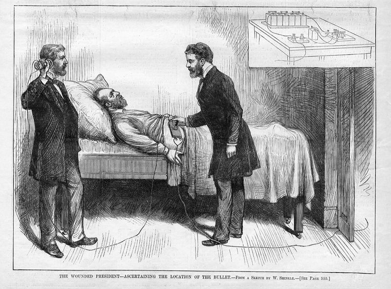 Прошли века. В XIX веке в США Александр Белл производил опыты по исследованию влияния металлических предметов на магнитное поле. В 1881 г. его попросили испытать свой прибор на раненом американском президенте Гарфильде. Увы, тогда металлодетектор был слишком примитивен, пулю в теле умирающего от раны президента ему найти не удалось.