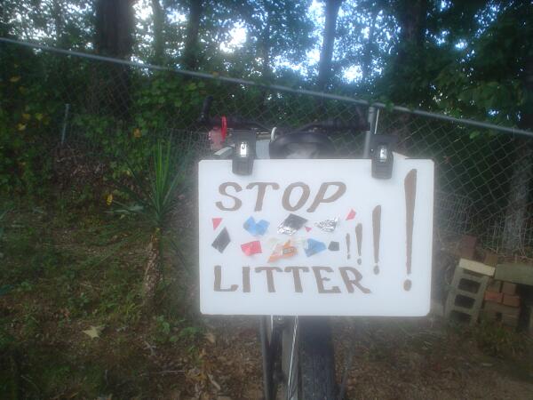 Игорь Ткачев, новые участки,которые я начал мониторить недавно, стали существенно чище. У меня такое ощущение, что я терроризирую водителей своим великом с мусорами спереди и сзади. Сегодня я выступал на обновлённом Пежо с обтекателем-багажником спередЕ. Прищепками на обтекателе по бокам от дедуси KFC я закрепил две шкурки бананов. Сзади над плакатом, на шомполе были нанизаны ал/банки, пласт/бутылки и бумажные стаканы - всё по науке воздействовать на подкорки.