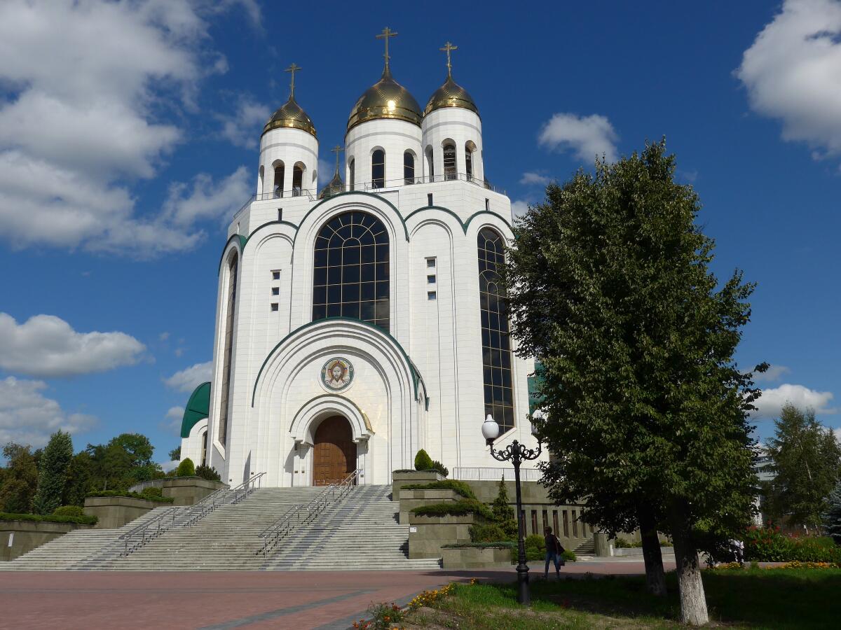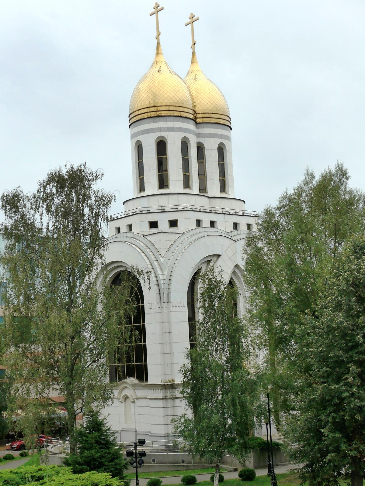 А рядом еще один небольшой, но тоже высокий, храм Святых благоверных Петра и Февронии, открытый рядом с кафедральным собором в июле 2010 года. Он входит в состав кафедрального храмового комплекса.