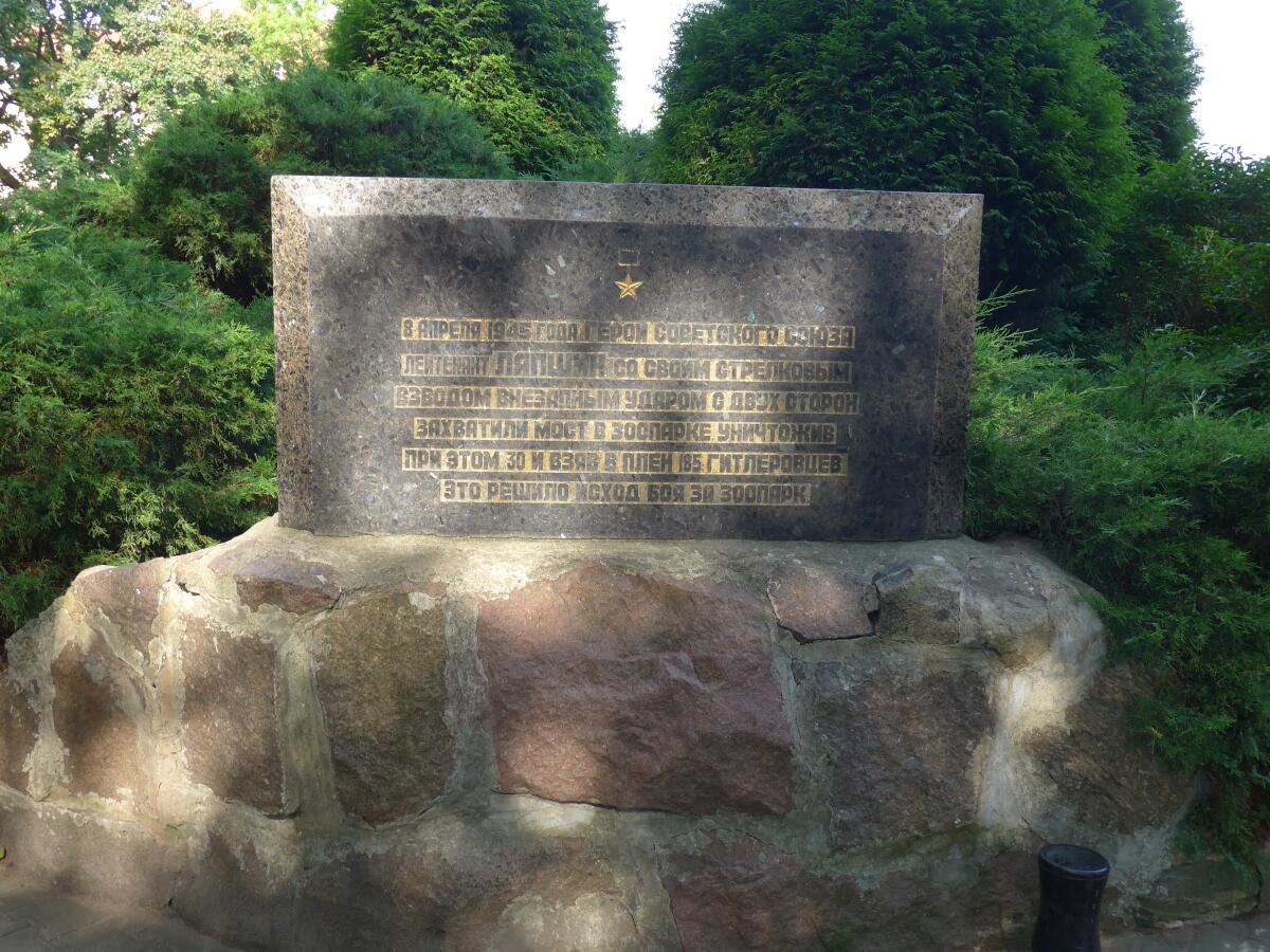 Есть на территории и небольшая стела, напоминающая о подвиге солдат, сражавшихся за этот уголок Кёнигсберга.