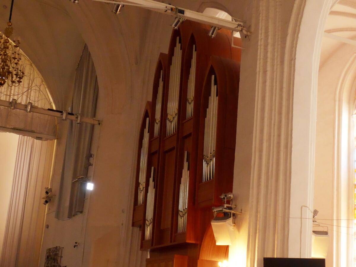Перед концертом ведущий рассказал зрителям о восстановлении собора и органов, их здесь два. Малый, или хоровой, орган появился в 2006 году, изготовлен в Германии, он расположен в задней части зала.