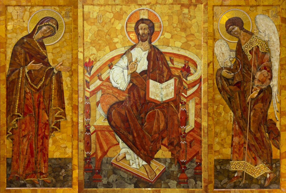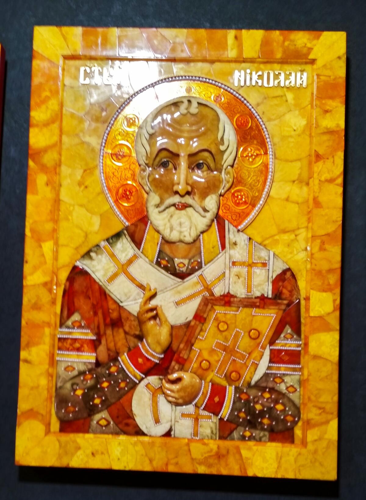 Потрясающе выполнен цикл икон Александра Крылова. Они изготовлены в технике флорентийской мозаики с использованием янтаря, дерева, кости, фольги. Это «Святой Николай Чудотворец», «Святой Георгий Победоносец», «Царская семья», «Иверская Божья Матерь» и другие. Мне не приходилось прежде видеть икон из янтаря.