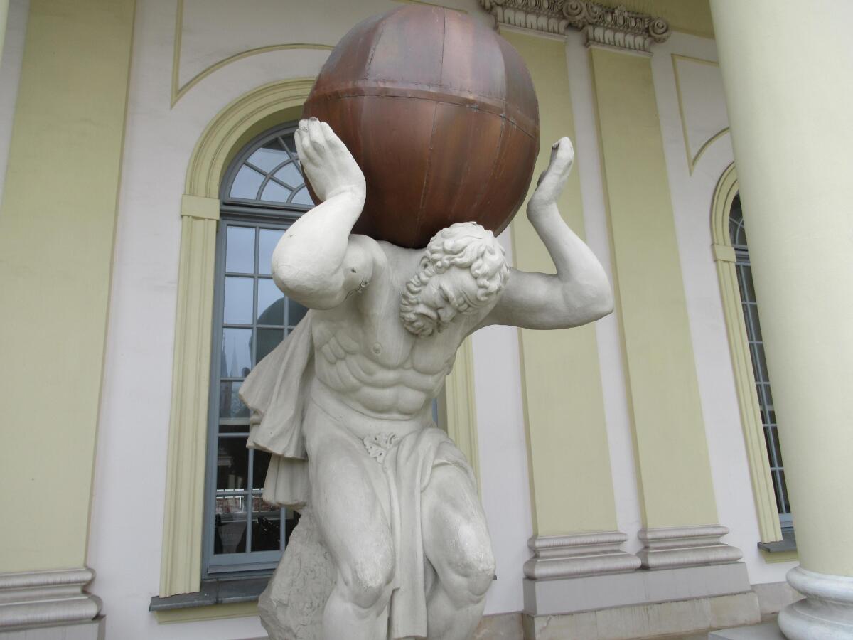 Мне даже повстречался знакомый уголок. Знакомый… из моего детства, что ли. Или из прежней жизни. Зеленая клумба — там действительно были живые зеленые листья в феврале, старая аллея (сказал бы «тенистая», если бы было лето) и какой-то спокойный, даже печальный, уголок… моего прошлого (здесь снова слеза по небритой щеке). Там же я пару раз сфоткался с несчастным атлантом (какой … придумал держать землю на плечах человеческих, пускай даже атлантов?!)