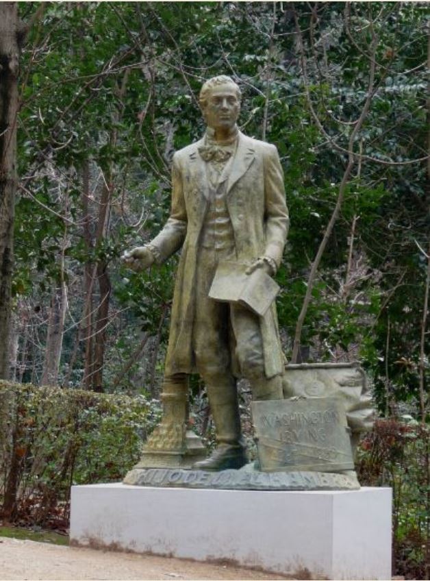Мы экипировались, как подводники, и так простояли в очереди среди таких же «обилеченных» около получаса. Очень хотелось сделать снимки, но руки были заняты сумками, зонтами, так что все фото делались на обратном пути, когда дождь подустал. А первым, что я запечатлела, был снимок памятника Ирвингу Вашингтону, стоящий на главной аллее. Дань моим детским воспоминаниям.