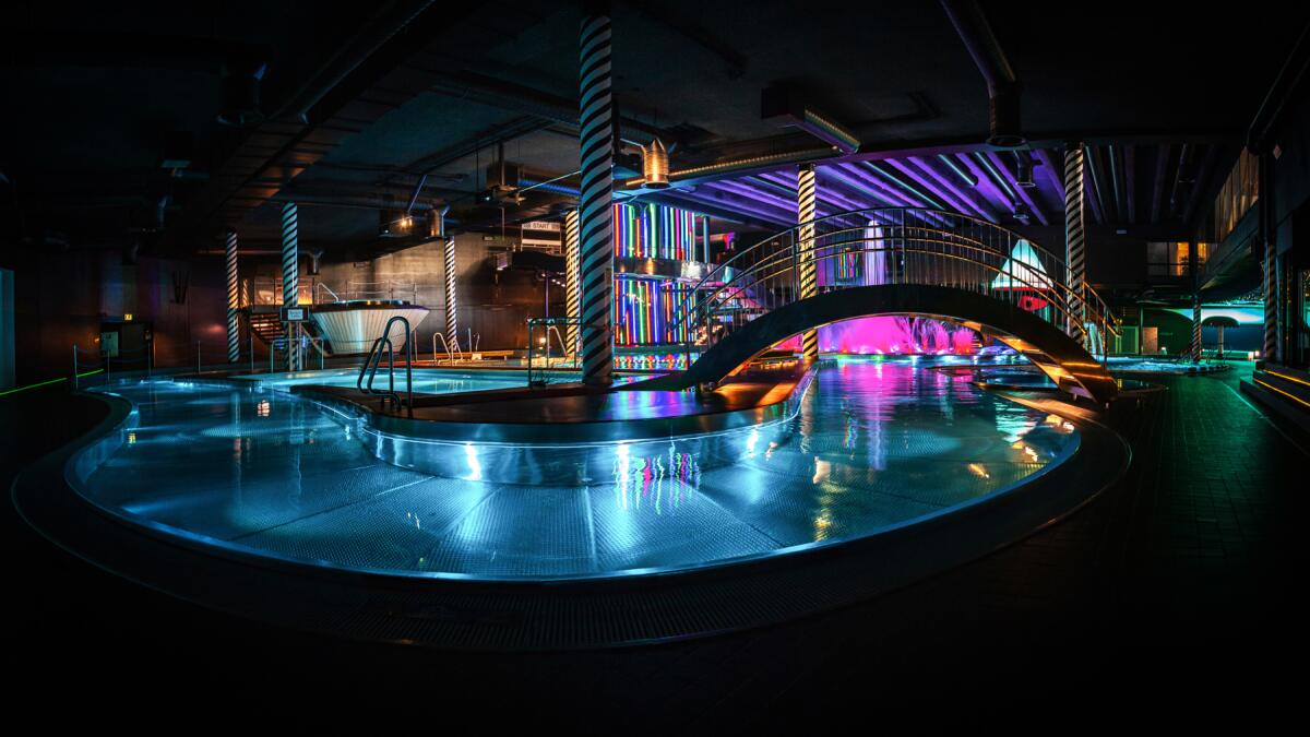 На втором этаже водного комплекса находится отдельная зона с саунами, которая так и называется «Мир саун». Вход сюда оплачивается отдельно. Здесь есть три сауны — стандартная сухая, традиционная финская и солевая — хамам, бассейн, бар и небольшой «чиллаут» с лежаками. В бассейне горит живой огонь.