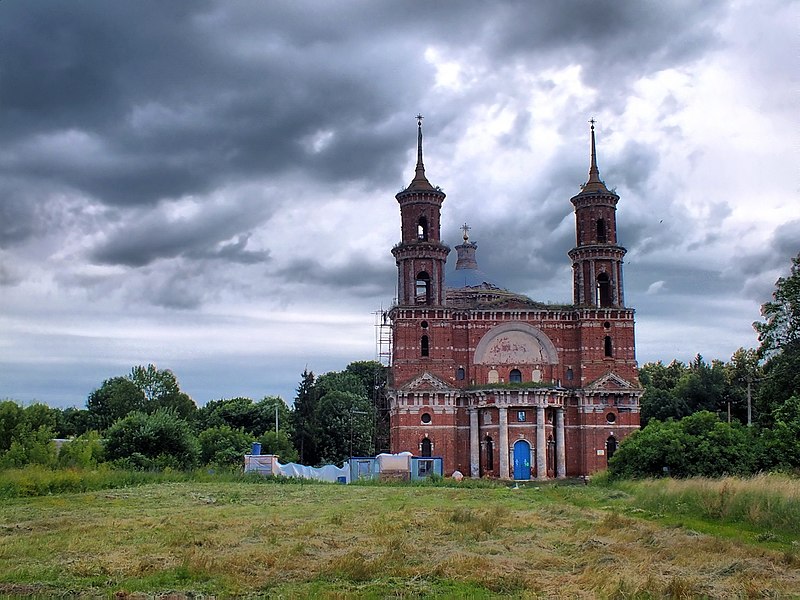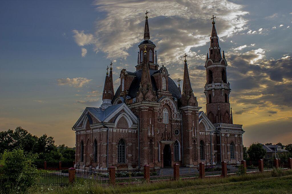И ещё одна потрясающая церковь, теперь — в усадьбе Вешаловка, которую, по легенде, строил тоже Баженов. Она открывается с дороги очень неожиданно: среди традиционного южнорусского пейзажа — вдруг огромный храм, своими башенками напоминающий московский кремль. Интересно, что Татищевы, на чьи средства была построена эта роскошная церковь, жили рядом с ней в одноэтажном деревянном домике, крытом соломой… Уже позднее, при других хозяевах, здесь появилась прекрасная усадьба, от которой, к сожалению, почти ничего не осталось…