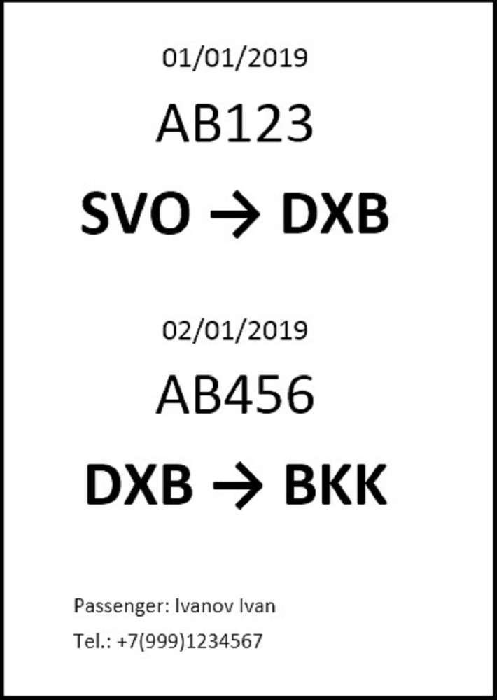 Пример. Пассажир Иванов Иван летит 1 января 2019 года из Москвы в Бангкок с пересадкой в Дубае. Багаж регистрируется сразу до Бангкока. Номер рейса Шереметьево-Дубай — АВ123. В Дубае Иванов выходит из самолета и, если позволяет время, может пройти паспортный контроль и выйти в город. При этом багаж он не получает. Самолет из Дубая в Бангкок вылетает рейсом АВ456 2 января 2019 года вместе с багажом Иванова и других пассажиров. Телефон нужно указывать для того, чтобы сотрудники аэропорта или авиакомпании могли оперативно связаться с вами, если чемодан случайно улетит другим рейсом.