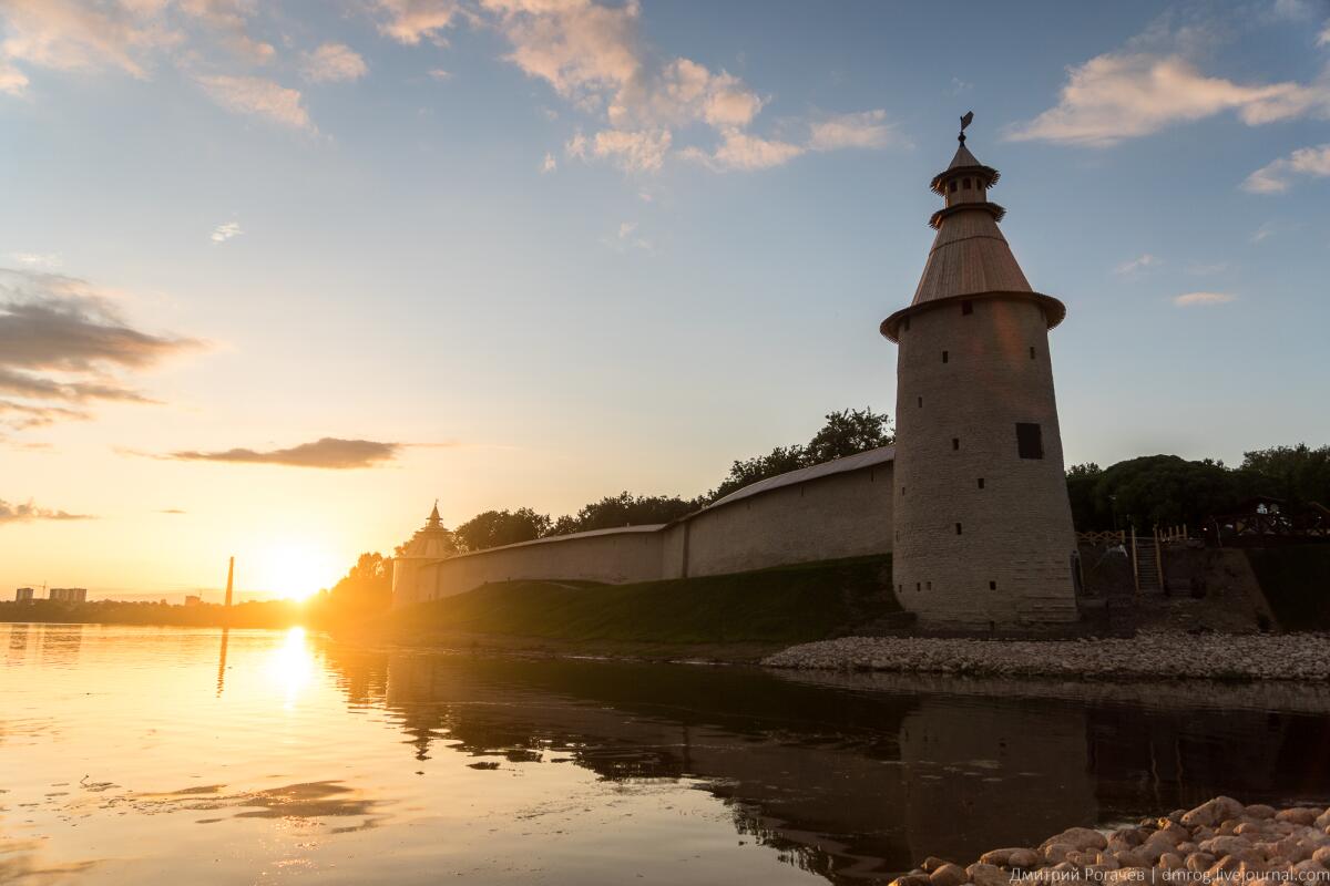 Жемчужина Пскова — древний Кремль (Кром), открывает свои неприступные стены с западной стороны. Здесь соединяются две реки, два водных пути, Пскова и Великая. Крепость на холме — тактически удачное решение. За всё время своего существования не один раз она отражала наступление врагов. Уже много веков город растет вокруг Кремля, дивного, белокаменного, с семью высокими башнями, часть которых гордо отражается в стеклянной глади воды. А Собор Святой Троицы виден своими золотыми маковками куполов из многих районов Пскова.