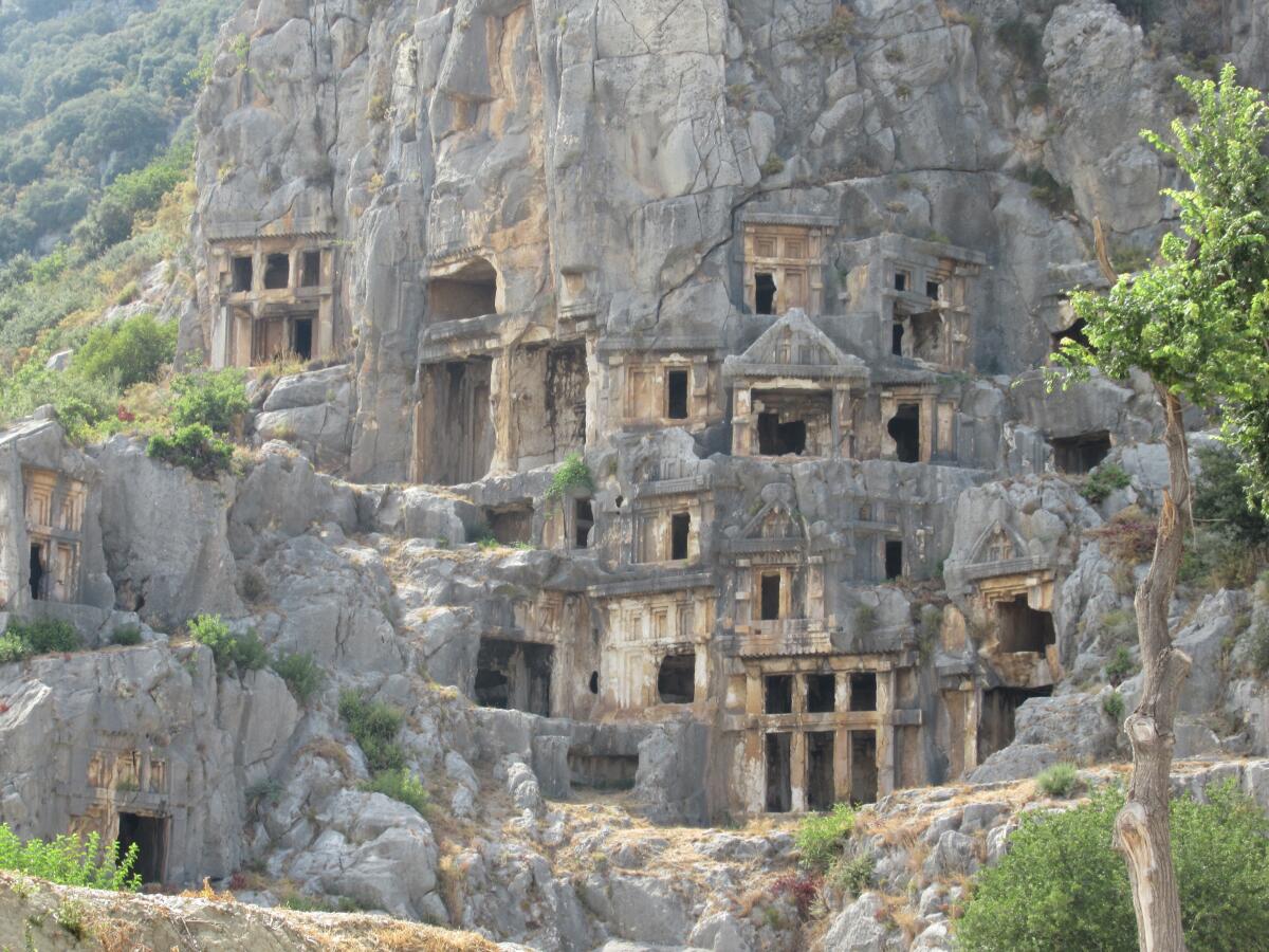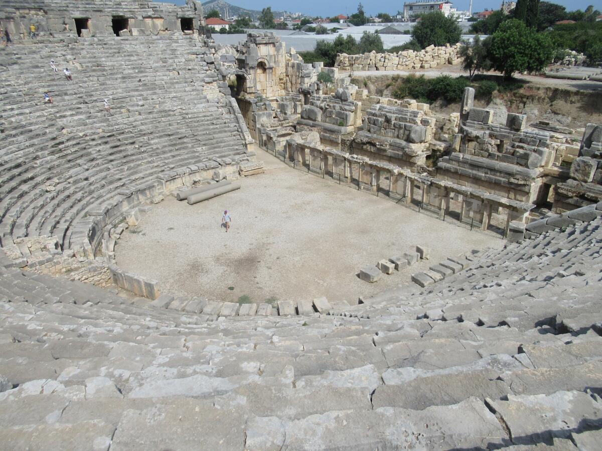 Другое интересное место на нашем маршруте — древняя столица Ликии, Мира. Место примечательно своими гробницами в греческом стиле, высеченными в скале, а также амфитеатром греко-римского театра.