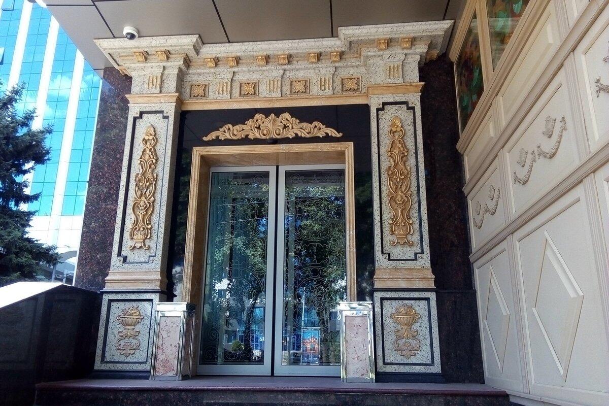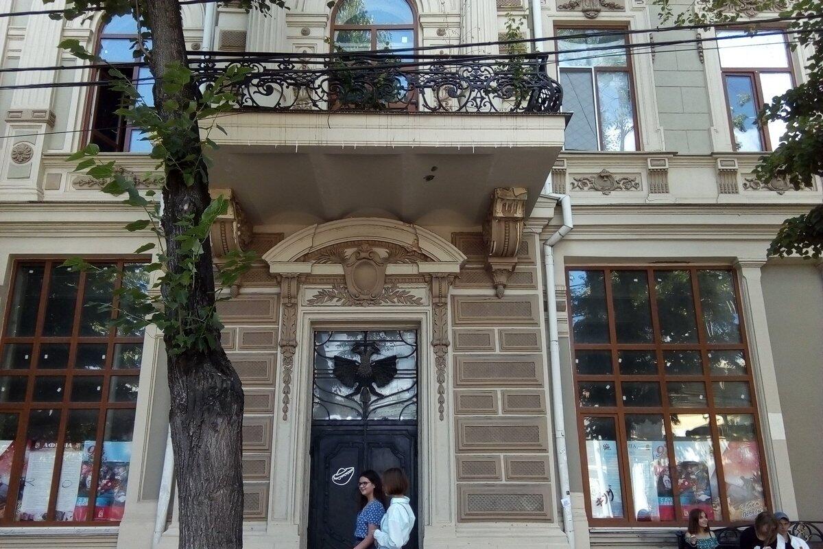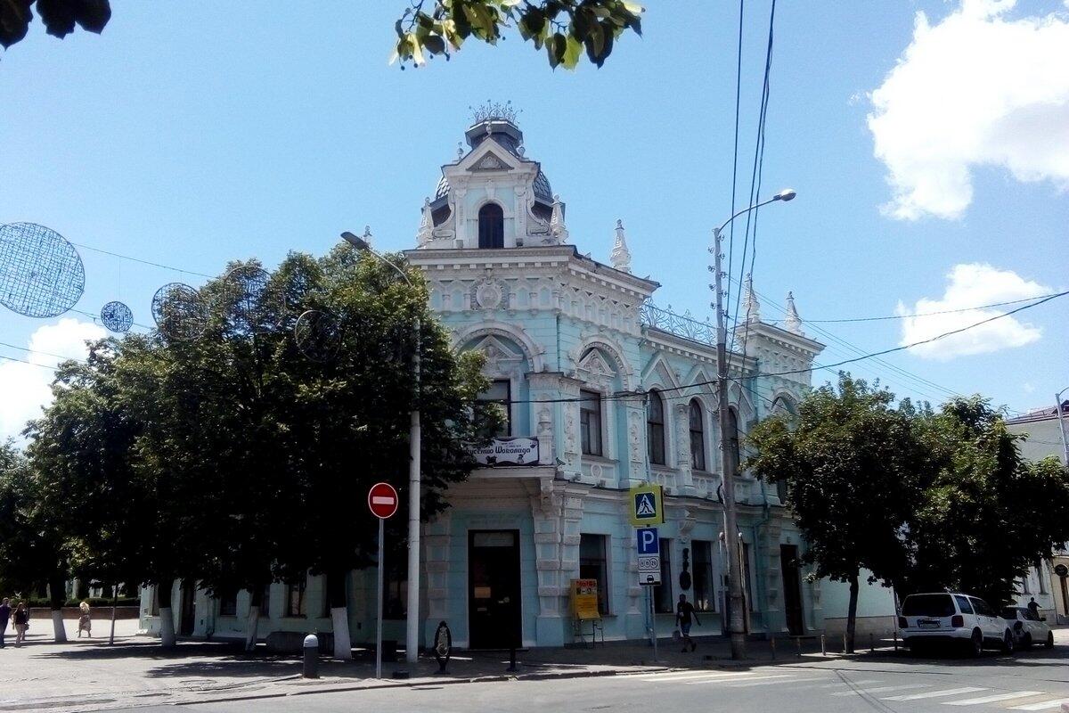 Очень красивое здание бирюзового цвета с лепниной на перекрестке — художественный музей им. Коваленко.