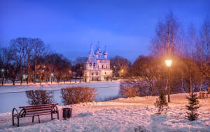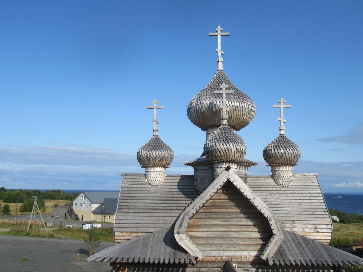 Вот и изящный силуэт церкви Дмитрия Солунского возносит к небу свои канонические пять главок: по одной на щипце каждой из бочек и последней, центральной, на врубленном в центре перекрытия глухом восьмерике. Шестая главка установлена на кровле пятигранного алтарного прируба.