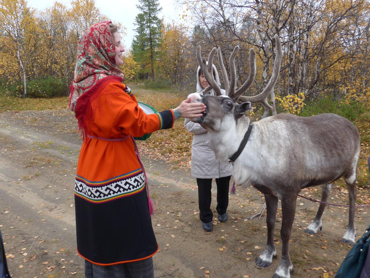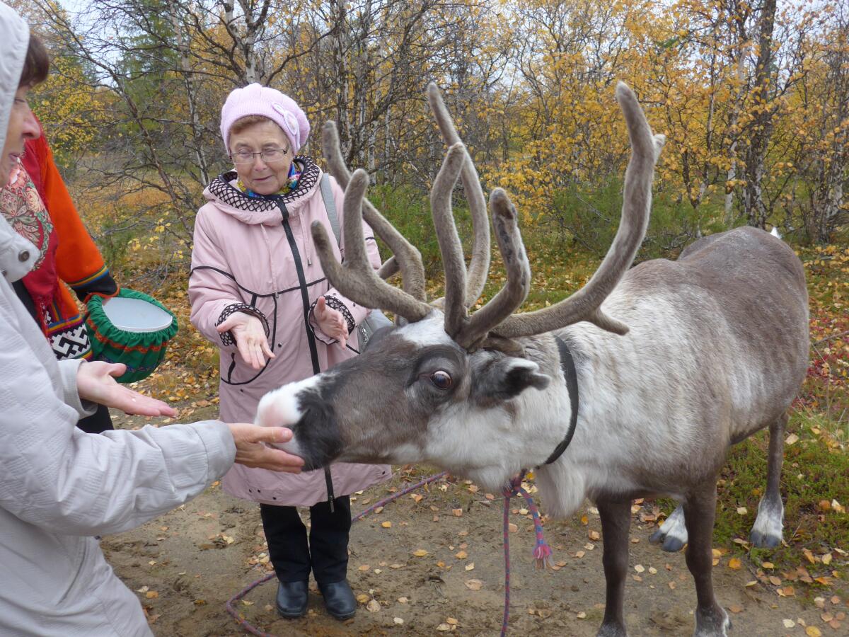 Мы покормили оленя капустой, кусочками моркови и хлеба, жаль, не было грибов, которые олени любят. Экскурсовод сказала, что если они собирают в тундре грибы, то стараются все их отдать своим любимцам. Конечно, все хотели сфотографироваться с оленем, но он не очень-то хотел позировать, крутил головой, когда гладили его, рвался с поводка.